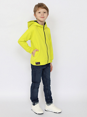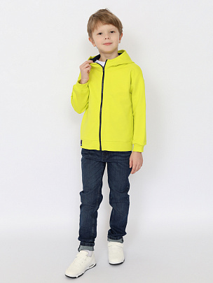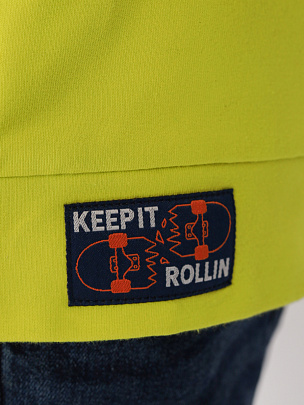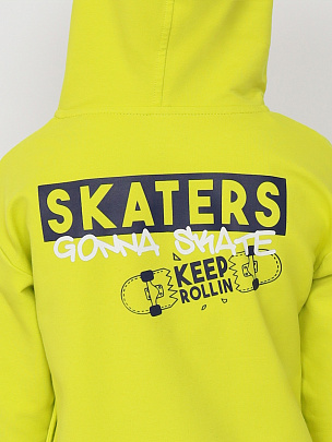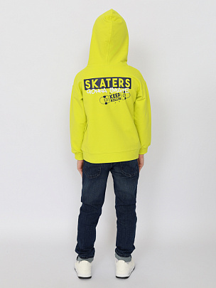 Толстовка с центральной застежкой, длинными рукавами, притачным поясом и манжетами. Манжеты выполнены из полотна с добавлением лайкры, пояс выполнен из основного полотна. Капюшон со шнурком и подкладкой контрастного цвета. Пояс декорирован вязаной нашивкой. Спина декорирована принтом "Скейтерам суждено кататься".