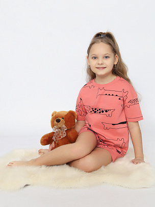 Пижама набивная из футболки и шорт. Футболка оверсайз с коротким рукавом. Горловина обработана притачной бейкой из рибаны с лайкрой. Шорты свободного покроя длиной до середины бедра. Цельнокроеный пояс обработан плоским швом вподгибку с одновременным прокладыванием резинки.