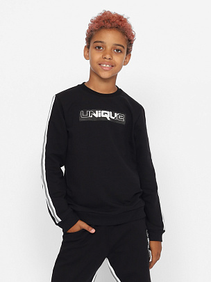 Джемпер с длинным втачным рукавом. Низ изделия и рукава обработаны поясом и манжетами из полотна с эластаном. Рукава декорированы вязаными лампасами. Перед декорирован принтом с эффектом "Высокая база" "УНИКАЛЬНЫЙ". Брюки с притачным поясом и манжетами. В пояс вставлена резинка и функциональный шнур. Пояс и манжеты выполнены из полотна с эластаном. На передней части брюк расположены карманы с подрезным бочком. Шаговые швы декорированы вязаным лампасом. Передняя половинка брюк декорирована принтом с эффектом "Высокая база" "УНИКАЛЬНЫЙ".