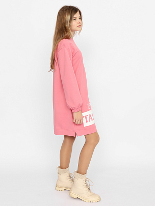 Прямое платье для девочки с длинными рукавами. Рукава широкие, снизу собраны на резинку. Нижние срезы переда и спинки обработаны притачным поясом из основного полотна с разрезами по бокам. В нижней части переда выполнен принт.