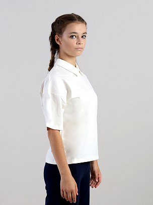 Джемпер для девочки с короткими рукавами, свободного силуэта, спущенным плечом и отложным воротником. Сзади застежка на пуговицу. Спереди декорирован металлическим лейблом.