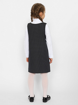 Сарафан для девочки выполнен из набивного футера - имитирует костюмную ткань. Школьный сарафан на широких бретелях без лишних застежек и замков имеет удобный А-силуэт. Добавление в состав эластана обеспечивает идеальную посадку и полную свободу движений. Спереди сарафана расположены прорезные карманы в шве. Сарафан удобно надевать поверх блузки, водолазки, джемпера или футболки, он будет актуален на протяжении всего учебного года.