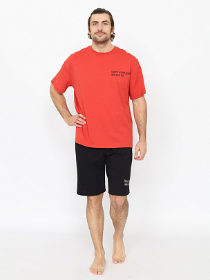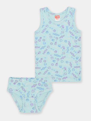 Комплект из гладкокрашенной майки и набивных трусов. Майка с плечом. Горловина и проймы обработаны окантовкой из основного полотна. Перед оформлен шелкографией. Верх трусов обработан плоским швом вподгибку с одновременным прокладыванием резинки. Проймы ножек обработаны окантовкой из основного полотна.