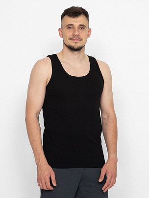 Майка мужская из кулирки. Срезы горловины и пройм окантованы бейкой из основного полотна.