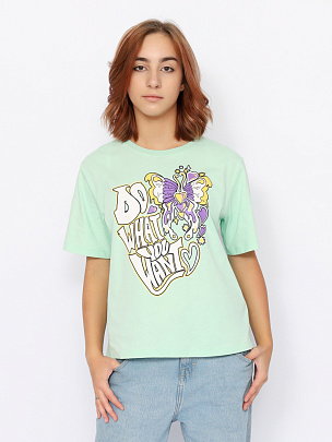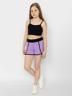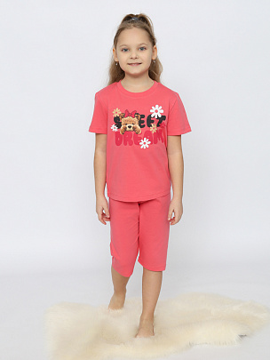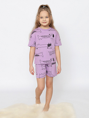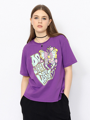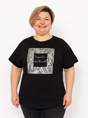 Футболка прямого силуэта с короткими рукавами. Горловина круглая, обработана притачной бейкой из рибаны с лайкрой. Перед футболки декорирован принтом с использованием глиттера.